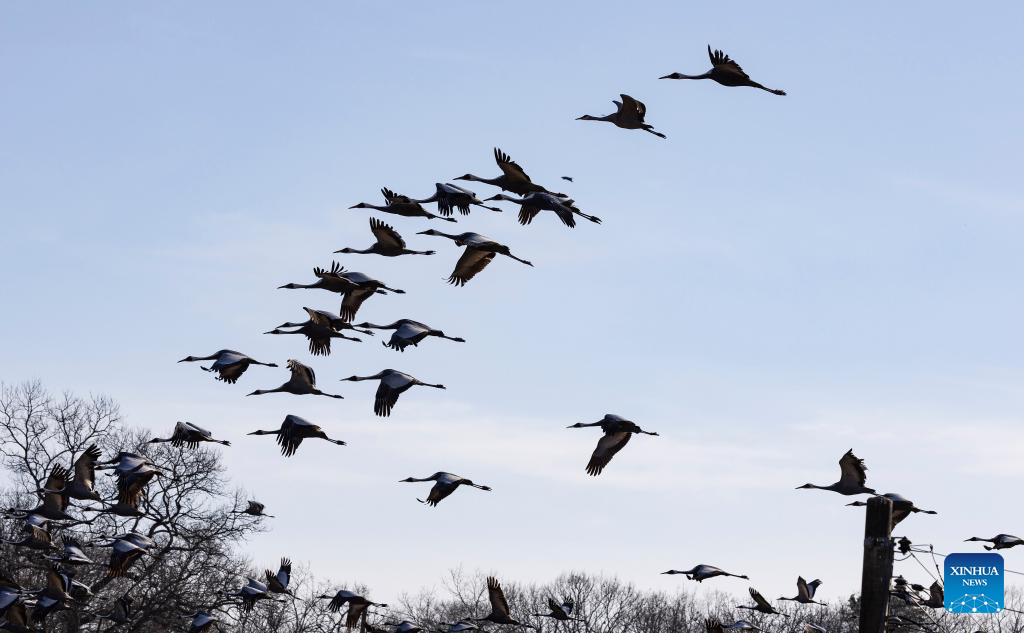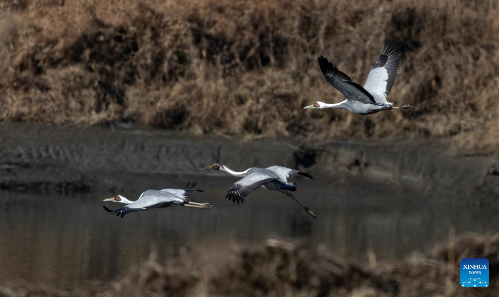 This photo taken on Dec. 21, 2025 shows white-naped cranes in Paju in Gyeonggi Province, South Korea. (Photo by Jun Hyosang/Xinhua)
