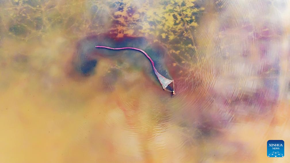 An aerial drone photo taken on June 8, 2025 shows a worker harvesting brine shrimps on a salt lake in Yuncheng, north China's Shanxi Province. (Photo by Jiang Hua/Xinhua)