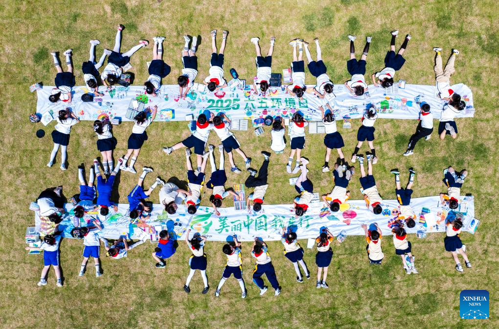 An aerial drone photo taken on June 4, 2025 shows primary school students painting during an environmental protection-themed event in Xinghua City, east China's Jiangsu Province. (Photo by Zhou Shegen/Xinhua)