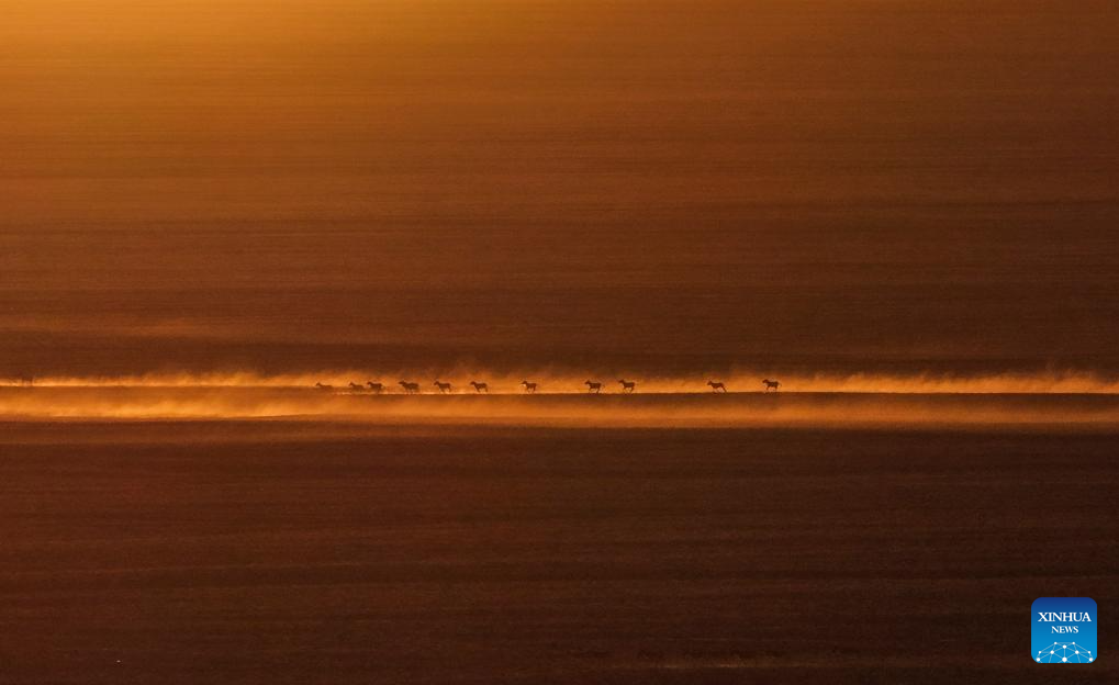An aerial drone photo taken on Dec. 9, 2025 shows Kiangs (Equus kiang) running on grasslands at the Altun Mountains National Nature Reserve in northwest China's Xinjiang Uygur Autonomous Region. (Xinhua/Xin Yuewei)
