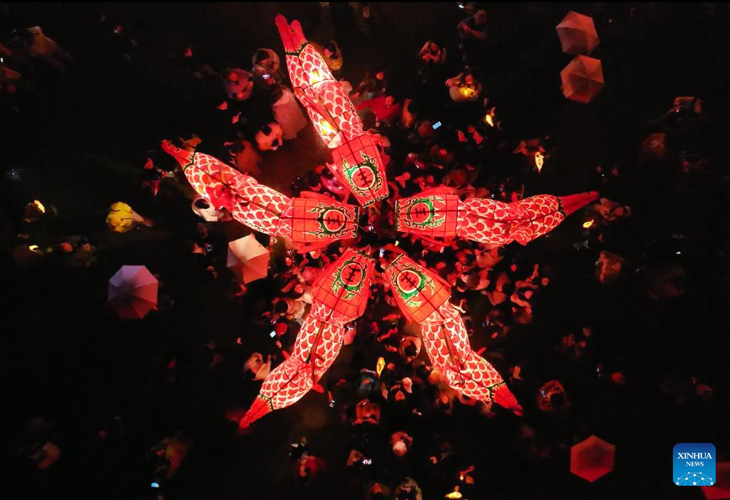A drone photo taken on Nov. 9, 2025 shows folk artists performing with traditional fish-shaped lanterns in Chengkan Village, Huangshan, east China's Anhui Province. (Xinhua/Cao Li)
