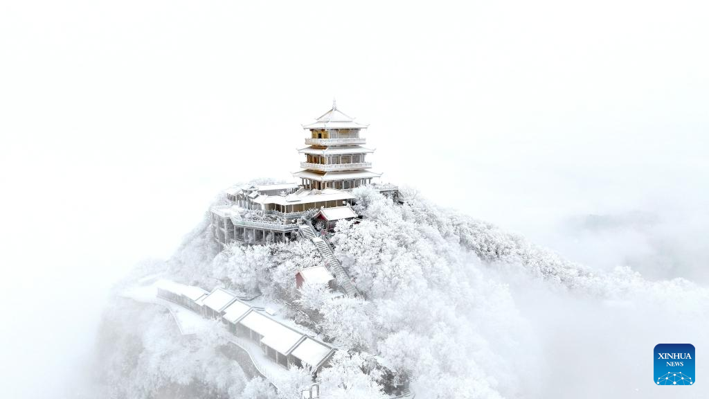 An aerial drone photo taken on Dec. 12, 2025 shows the snow scenery of the Wangwu Mountain scenic spot in Jiyuan City, central China's Henan Province. (Photo by Duan Erping/Xinhua)