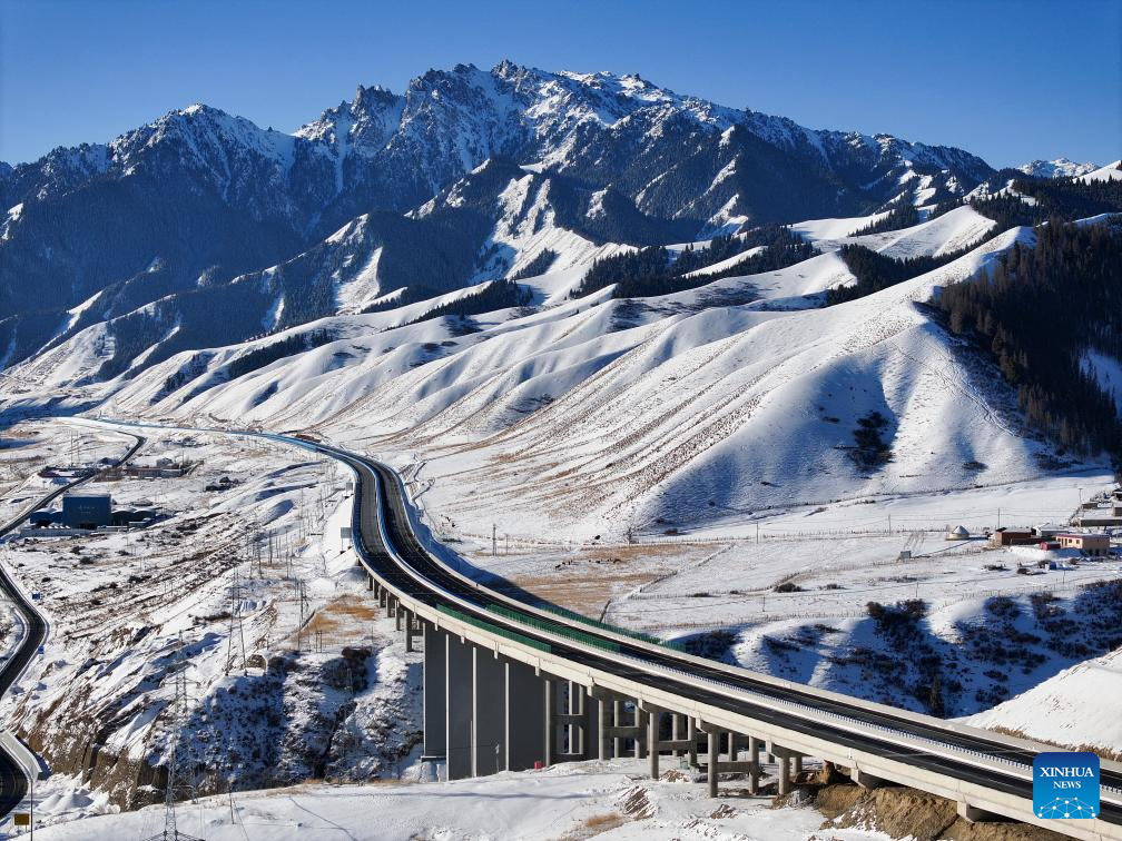 An aerial drone photo taken on Dec. 23, 2025 shows a view of the Urumqi-Yuli Expressway in northwest China's Xinjiang Uygur Autonomous Region. The 22.13-km Tianshan Shengli Tunnel, the world's longest expressway tunnel, officially opened to traffic on Dec. 26, 2025. The tunnel is part of the G0711 Urumqi-Yuli Expressway, which was put into operation on the same day and serves as a vital artery linking city clusters in northern and southern Xinjiang. (Xinhua/Wang Fei)