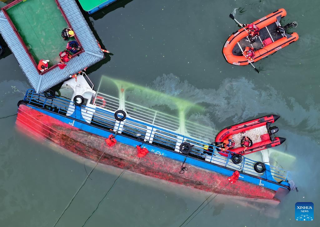 An aerial drone photo taken on May 5, 2025 shows rescuers carrying out search and rescue operations after a boat capsizing accident in Qianxi City, southwest China's Guizhou Province. (Xinhua/Liu Xu)