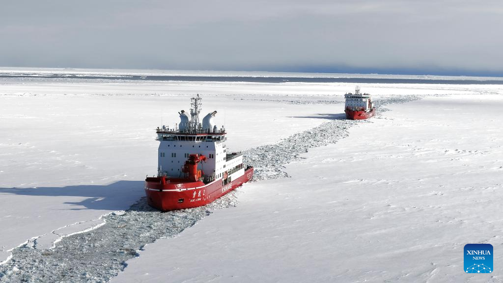 A drone photo taken on Dec. 5, 2025 shows research icebreakers Xuelong and Xuelong 2 (front) conducting China's 42nd Antarctic expedition. (Photo by Chen Dongbin/Xinhua)