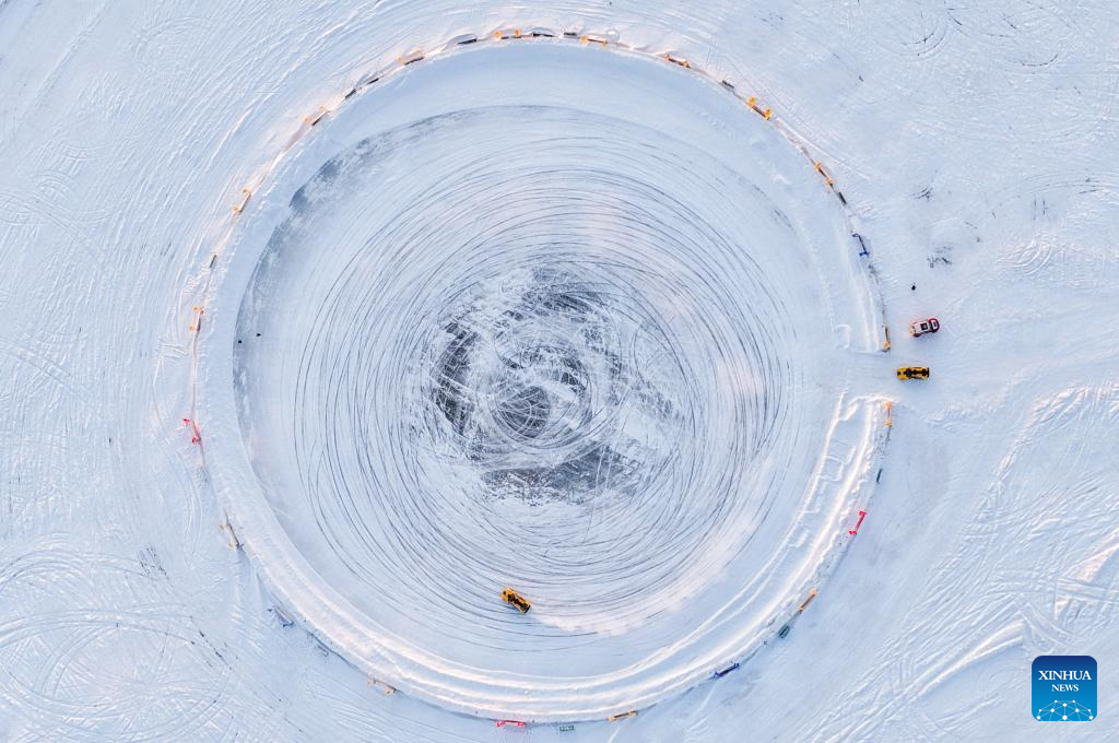 An aerial drone photo taken on Dec. 21, 2025 shows a race car drifting on ice at an ice and snow sports base in Hulun Buir, north China's Inner Mongolia Autonomous Region. (Xinhua/Lian Zhen)
