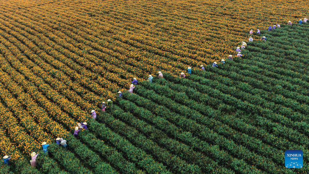 An aerial drone photo taken on Aug. 23, 2025 shows farmers harvesting marigold flowers in Tengchong, southwest China's Yunnan Province. (Photo by Gong Zujin/Xinhua)