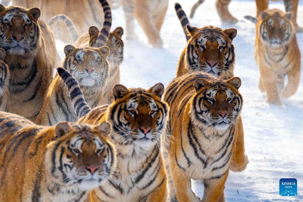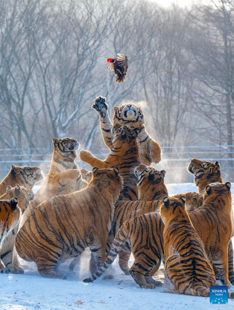 Siberian tigers vie for food in the snow at the Siberian Tiger Park in Hailin, northeast China's Heilongjiang Province, on Jan. 21, 2026. (Photo by He Huawen/Xinhua)