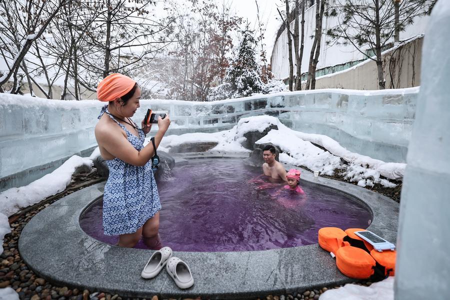 Visitors pose for pictures in front of a wall made of ice bricks with frozen flowers inside at a hot spring resort in Shenyang, northeast China's Liaoning Province, Jan. 17, 2025. (Xinhua/Li Gang)Visitors play on snow at a hot spring resort in Shenyang, northeast China's Liaoning Province, Jan. 9, 2026. (Xinhua/Pan Yulong)Visitors enjoy outdoor hot spring at a hot spring resort in Shenyang, northeast China's Liaoning Province, Jan. 9, 2026. (Xinhua/Pan Yulong)