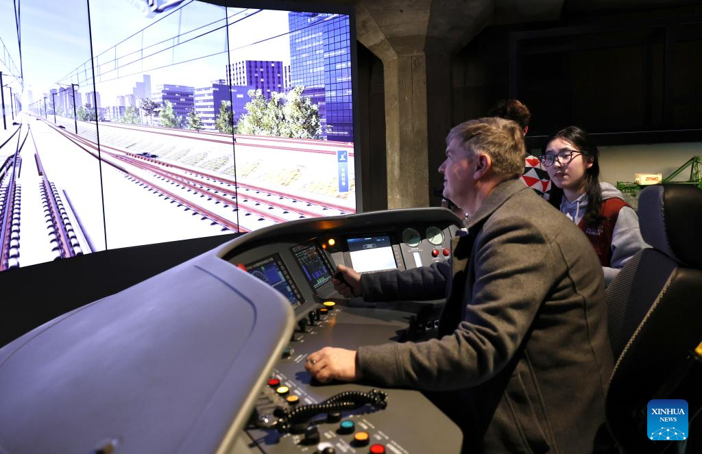 A guest experiences simulated driving of high-speed train at the WorldSkills Museum in Shanghai, east China, Feb. 4, 2026. As one of the 48th WorldSkills Competition Preparation Week activities, the Shanghai promotion campaign and intangible cultural heritage experience event was held here on Wednesday, which was attended by over 700 guests from home and abroad. (Xinhua/Fang Zhe)