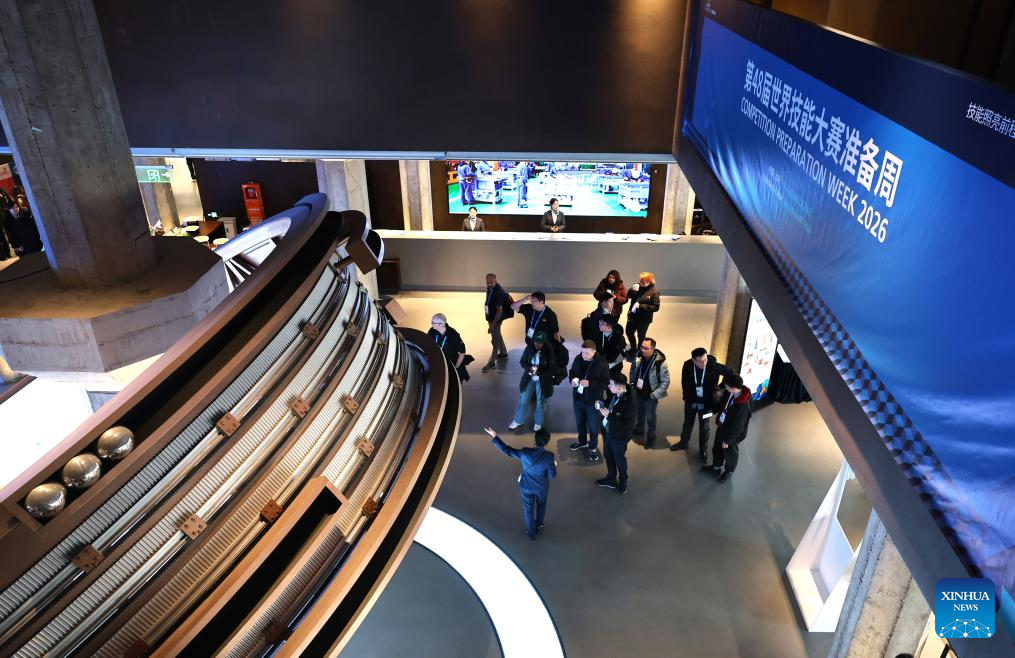 Guests listen to the introduction of a guide at the WorldSkills Museum in Shanghai, east China, Feb. 4, 2026. As one of the 48th WorldSkills Competition Preparation Week activities, the Shanghai promotion campaign and intangible cultural heritage experience event was held here on Wednesday, which was attended by over 700 guests from home and abroad. (Xinhua/Fang Zhe)