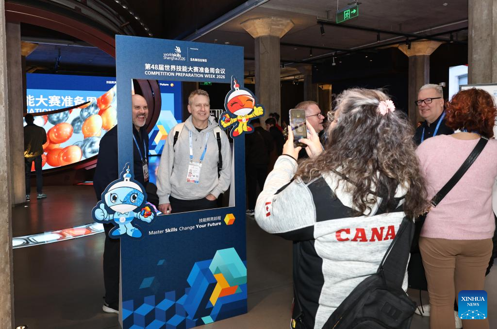 Guests pose for a photo in front of the exhibition board of the 48th WorldSkills Competition Preparation Week at WorldSkills Museum in Shanghai, east China, Feb. 4, 2026. As one of the 48th WorldSkills Competition Preparation Week activities, the Shanghai promotion campaign and intangible cultural heritage experience event was held here on Wednesday, which was attended by over 700 guests from home and abroad. (Xinhua/Fang Zhe)