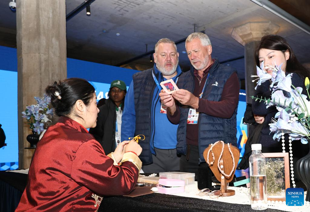 Guests get to know Chinese knots at an intangible cultural heritage exhibition stand at the WorldSkills Museum in Shanghai, east China, Feb. 4, 2026. As one of the 48th WorldSkills Competition Preparation Week activities, the Shanghai promotion campaign and intangible cultural heritage experience event was held here on Wednesday, which was attended by over 700 guests from home and abroad. (Xinhua/Fang Zhe)