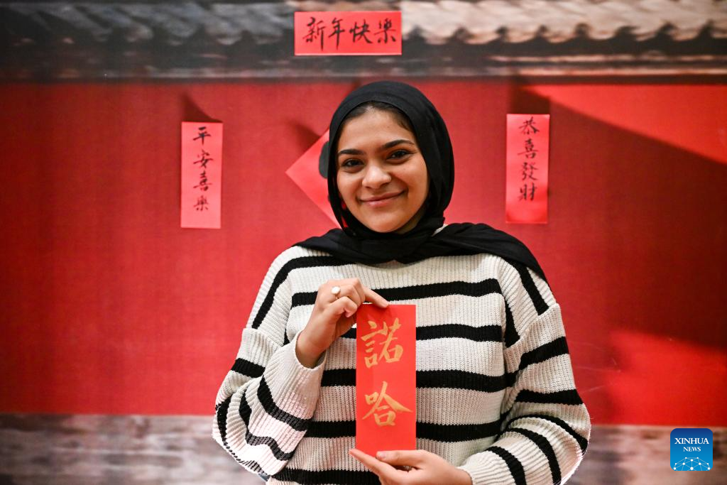 A guest displays the calligraphy of her Chinese name at a Spring Festival gala in Cairo, Egypt, on Feb. 8, 2026. The gala was held here on Sunday to celebrate the upcoming Chinese Spring Festival, where participants enjoyed traditional Chinese cuisine, experienced intangible cultural heritages, and watched cultural performances. (Xinhua/Xin Mengchen)