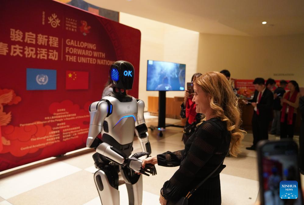 A guest shakes hands with a robot at a Spring Festival celebration at the UN headquarters in New York, on Feb. 9, 2026. (Xinhua/Zhang Fengguo)