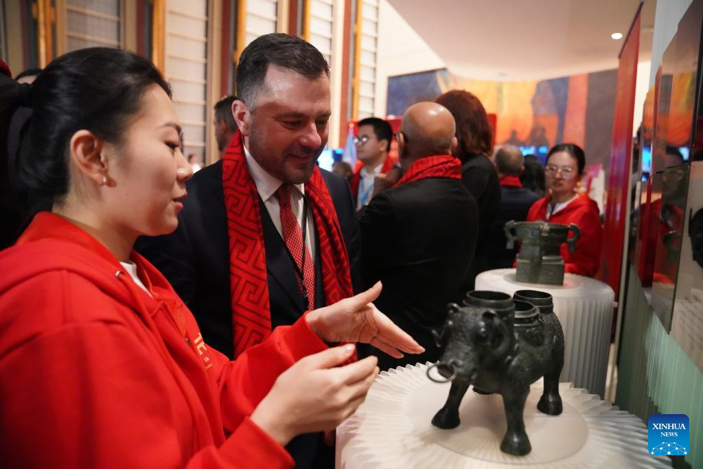 A guest listens to the introduction of a bronze artifact at a Spring Festival celebration at the UN headquarters in New York, on Feb. 9, 2026. (Xinhua/Zhang Fengguo)