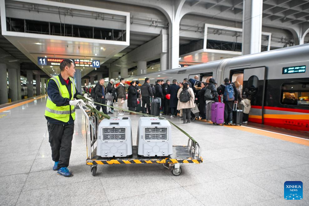 A staff member prepares to place pet transport cases on a bullet train at Chongqing West Railway Station in southwest China's Chongqing Municipality, Feb. 9, 2026. Chongqing railway authorities have launched a pilot pet consignment service on high-speed railways on designated routes during the ongoing Spring Festival travel rush.