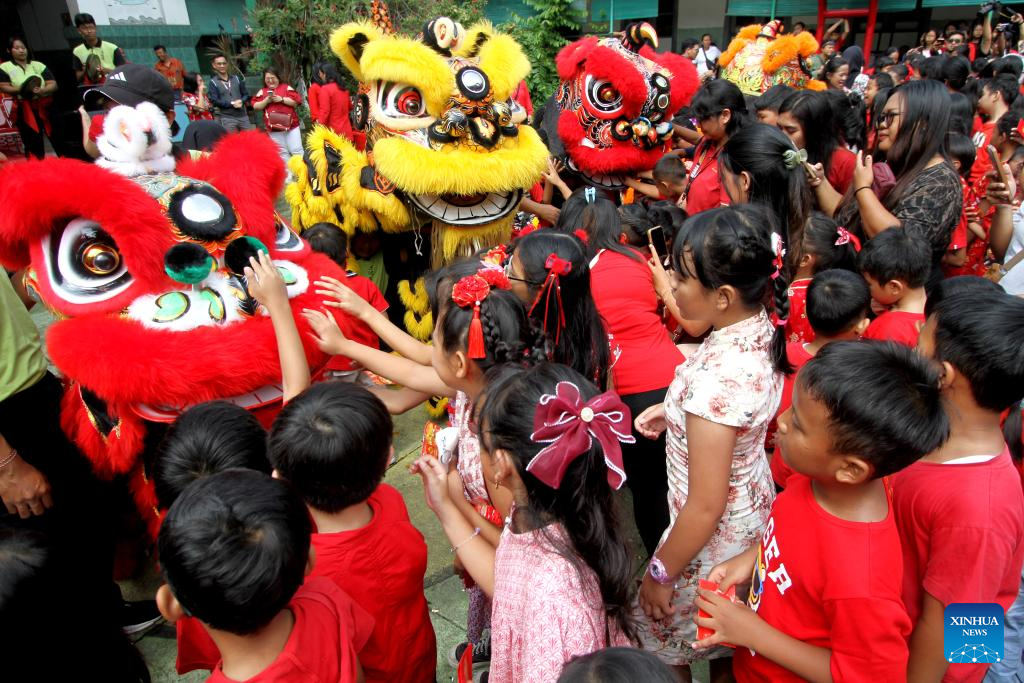 Elementary students interact with lion dance performers during a performance to welcome the Chinese New Year in Surakarta, Central Java, Indonesia, Feb. 10, 2026. (Photo by Bram Selo/Xinhua)