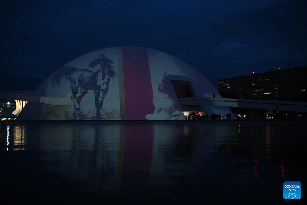 The exterior of the National Museum of the Republic in Brasilia is illuminated by a light show to celebrate the upcoming Spring Festival in Brasilia, Brazil, Feb. 10, 2026. (Photo by Lucio Tavora/Xinhua)