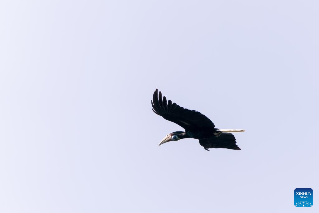 A hornbill flies over Shiti Village, Yingjiang County, southwest China's Yunnan Province, Feb. 7, 2026. In Yunnan Tongbiguan provincial nature reserve, hornbills, a species under first-class state protection in China, are in a critical period of breeding preparation. Members of the "Hornbill Patrol Team" conduct regular patrols to ensure their safety during the breeding season.