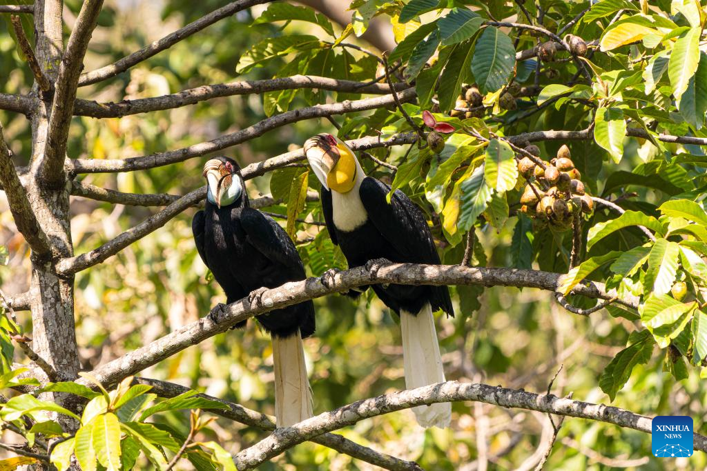 Hornbills perch on a tree in Shiti Village, Yingjiang County, southwest China's Yunnan Province, Feb. 7, 2026. In Yunnan Tongbiguan provincial nature reserve, hornbills, a species under first-class state protection in China, are in a critical period of breeding preparation. Members of the "Hornbill Patrol Team" conduct regular patrols to ensure their safety during the breeding season.
