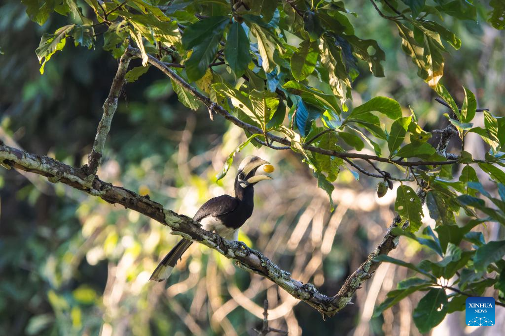 A hornbill eats fruit on a tree in Shiti Village, Yingjiang County, southwest China's Yunnan Province, Feb. 7, 2026. In Yunnan Tongbiguan provincial nature reserve, hornbills, a species under first-class state protection in China, are in a critical period of breeding preparation. Members of the "Hornbill Patrol Team" conduct regular patrols to ensure their safety during the breeding season.