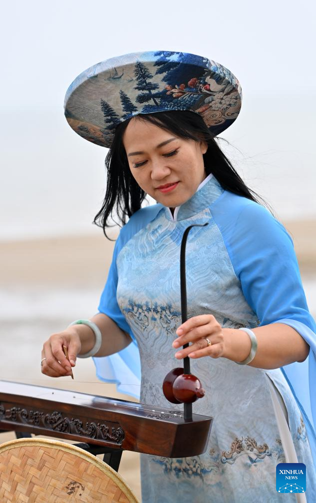 Su Haizhen plays the Duxianqin on Jintan Beach in Dongxing City, south China's Guangxi Zhuang Autonomous Region, Feb. 7, 2026. On Jintan Beach in Dongxing City of south China's Guangxi Zhuang Autonomous Region, Su Haizhen plays the Duxianqin, or single-stringed musical instrument, showcasing the unique charm of the Jing ethnic group's special instrument.