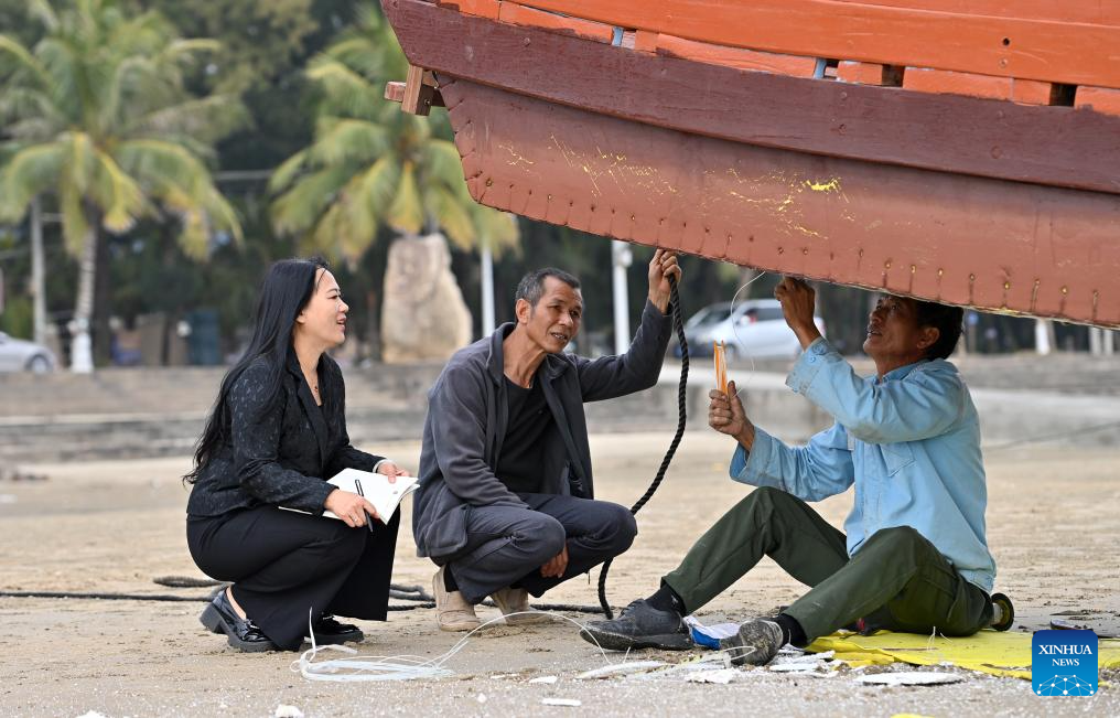 Su Haizhen (1st L) asks for fishers' advice on issues concerning people's livelihood and development of traditional culture on Jintan Beach in Dongxing City, south China's Guangxi Zhuang Autonomous Region, Feb. 7, 2026. On Jintan Beach in Dongxing City of south China's Guangxi Zhuang Autonomous Region, Su Haizhen plays the Duxianqin, or single-stringed musical instrument, showcasing the unique charm of the Jing ethnic group's special instrument. (Xinhua/Lu Boan)
