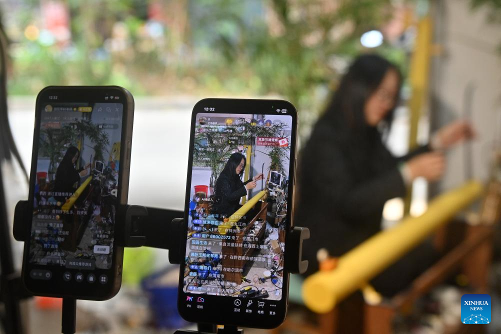 Su Haizhen introduces Duxianqin to audience via live-streaming in Dongxing City, south China's Guangxi Zhuang Autonomous Region, Feb. 7, 2026. On Jintan Beach in Dongxing City of south China's Guangxi Zhuang Autonomous Region, Su Haizhen plays the Duxianqin, or single-stringed musical instrument, showcasing the unique charm of the Jing ethnic group's special instrument.(Xinhua/Lu Boan)