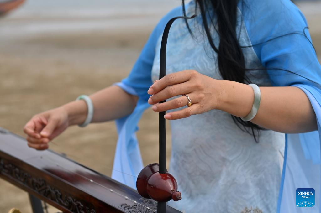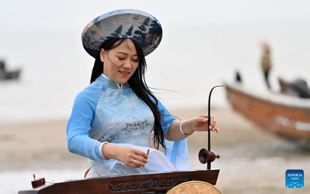 Su Haizhen plays the Duxianqin on Jintan Beach in Dongxing City, south China's Guangxi Zhuang Autonomous Region, Feb. 7, 2026. On Jintan Beach in Dongxing City of south China's Guangxi Zhuang Autonomous Region, Su Haizhen plays the Duxianqin, or single-stringed musical instrument, showcasing the unique charm of the Jing ethnic group's special instrument. (Xinhua/Lu Boan)