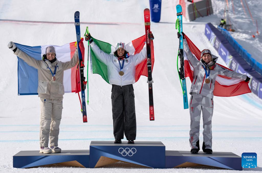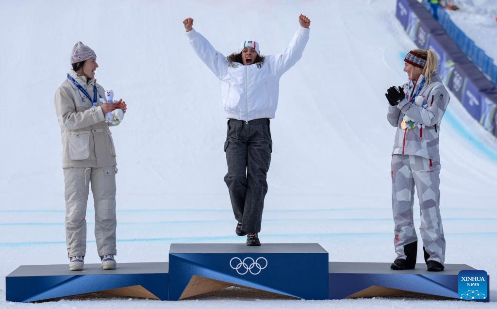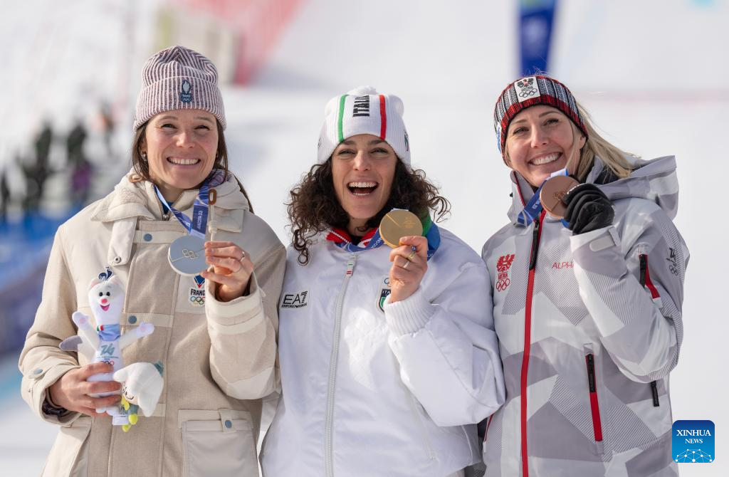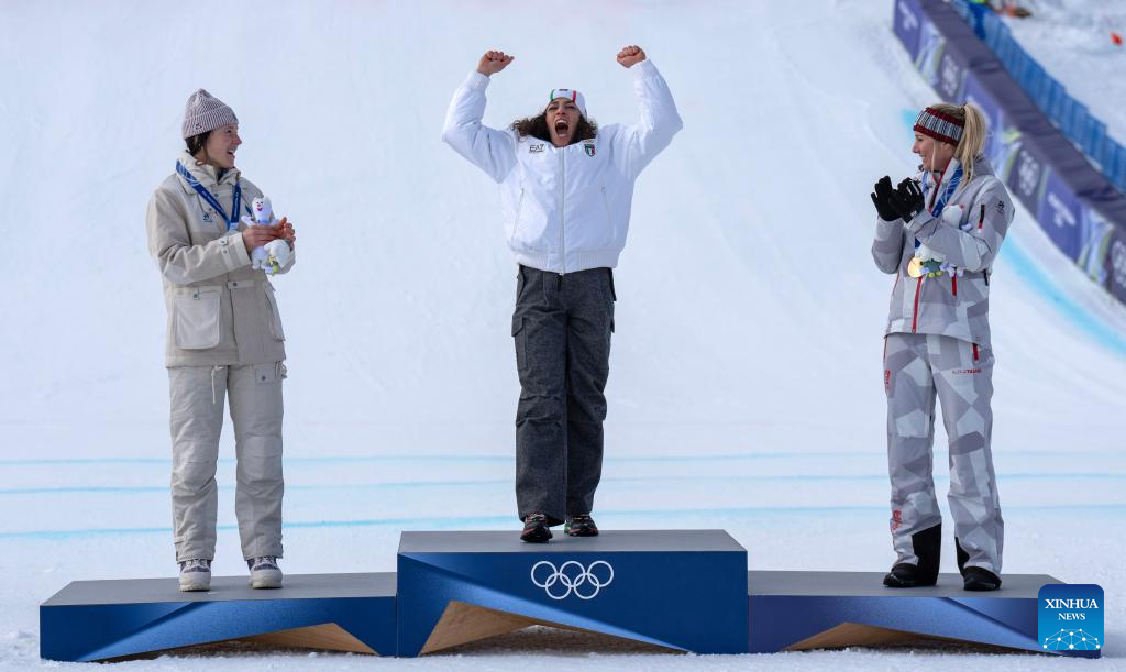 Gold medalist Federica Brignone (C) of Italy celebrates during the awarding ceremony for the alpine skiing women's Super-G at the 2026 Milan-Cortina Winter Olympics in Cortina D'Ampezzo, Italy, Feb. 12, 2026. (Xinhua/Fei Maohua)
