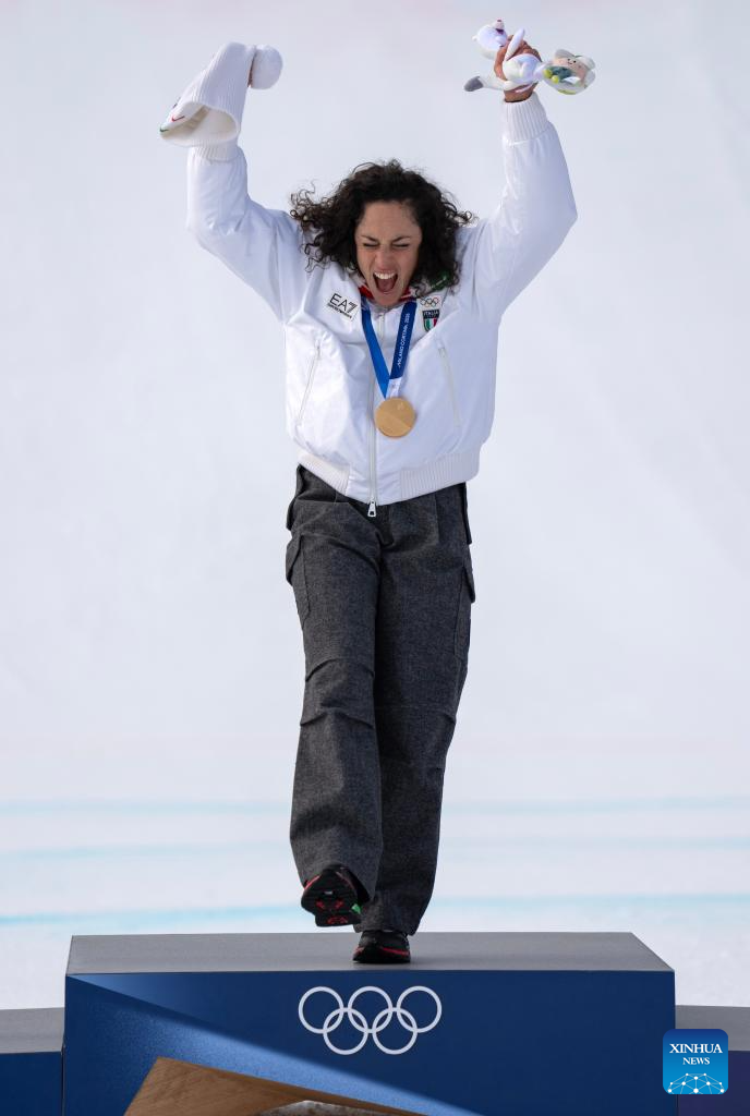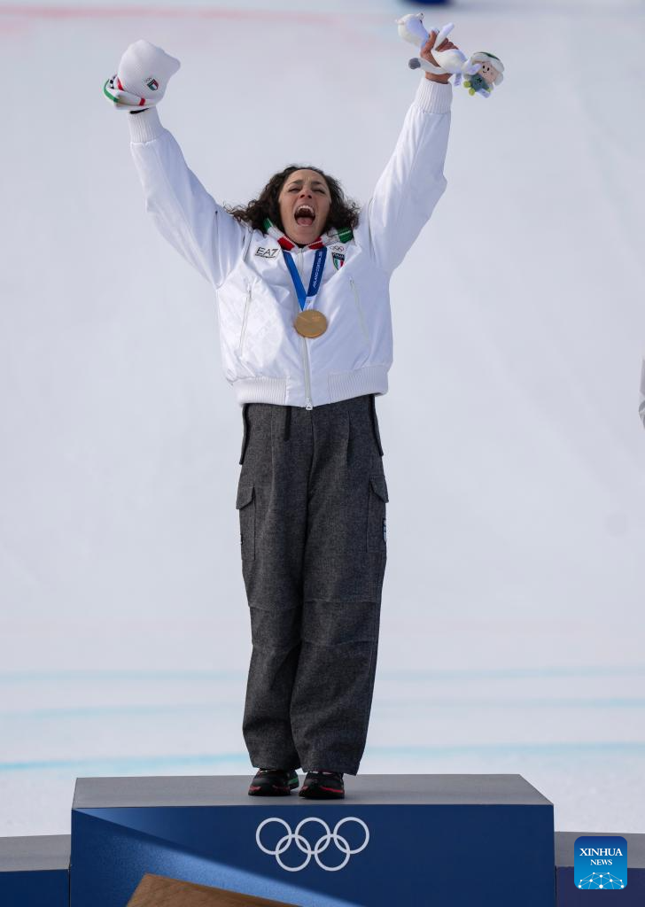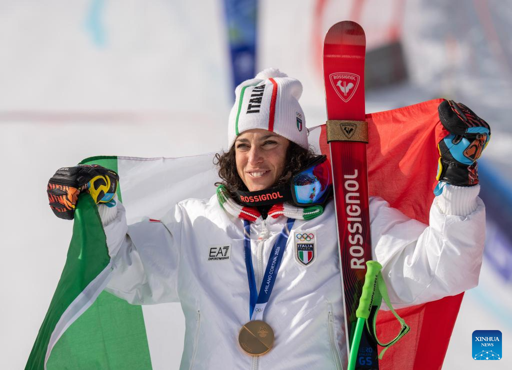 Gold medalist Federica Brignone of Italy reacts during the awarding ceremony for the alpine skiing women's Super-G at the 2026 Milan-Cortina Winter Olympics in Cortina D'Ampezzo, Italy, Feb. 12, 2026. (Xinhua/Fei Maohua)