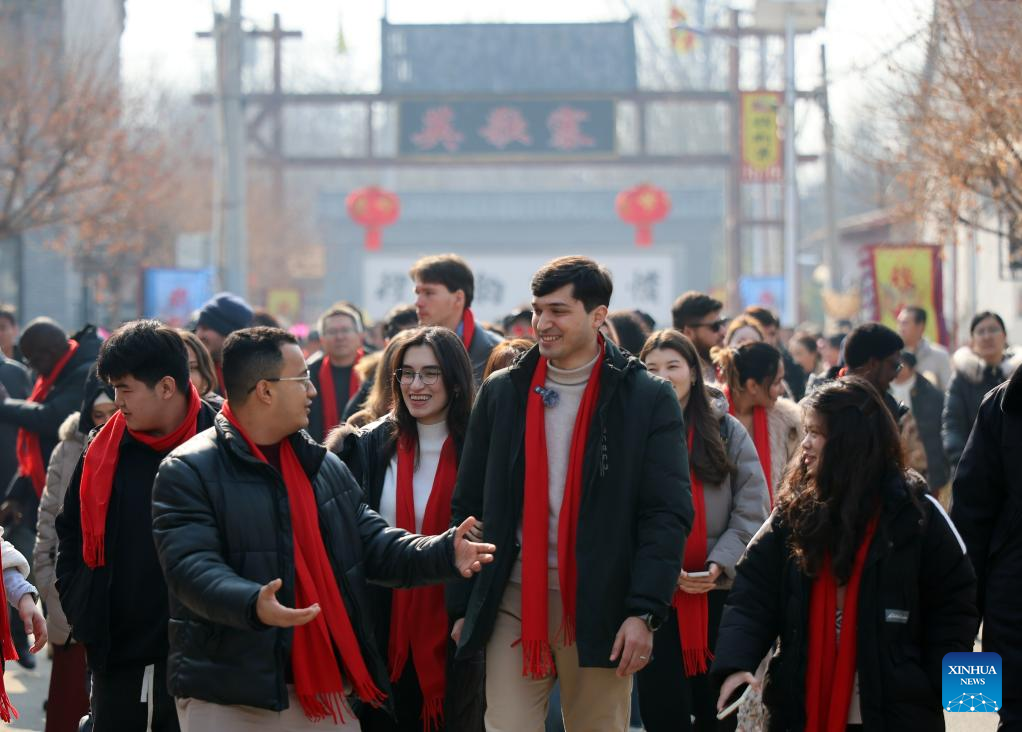 Suleimanov Umar (C front) and his friends visit Yinggezhai Village in Chuanfangyu Town of Jizhou District, north China's Tianjin, Feb. 10, 2026. On the occasion of traditional Chinese Xiaonian Festival in northern China, which fell on Tuesday this year, Suleimanov Umar, a 26-year-old Tajikistan student in Nankai University of Tianjin, and other international students visited a local festive fair in Chuanfangyu Town to experience the vibrant traditions of Chinese New Year. Celebrated on the 23rd day of the last month of the Chinese lunar calendar, Xiaonian is a festival marking the start of the countdown to the Chinese New Year.