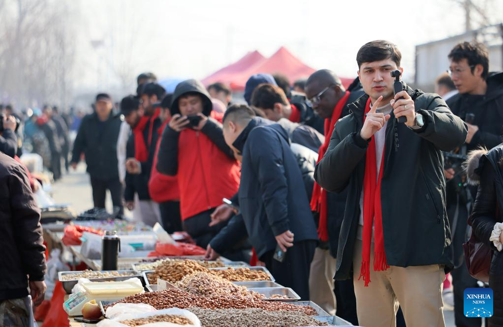 Suleimanov Umar (front) films a video at a festive fair in Chuanfangyu Town of Jizhou District, north China's Tianjin, Feb. 10, 2026. On the occasion of traditional Chinese Xiaonian Festival in northern China, which fell on Tuesday this year, Suleimanov Umar, a 26-year-old Tajikistan student in Nankai University of Tianjin, and other international students visited a local festive fair in Chuanfangyu Town to experience the vibrant traditions of Chinese New Year. Celebrated on the 23rd day of the last month of the Chinese lunar calendar, Xiaonian is a festival marking the start of the countdown to the Chinese New Year.