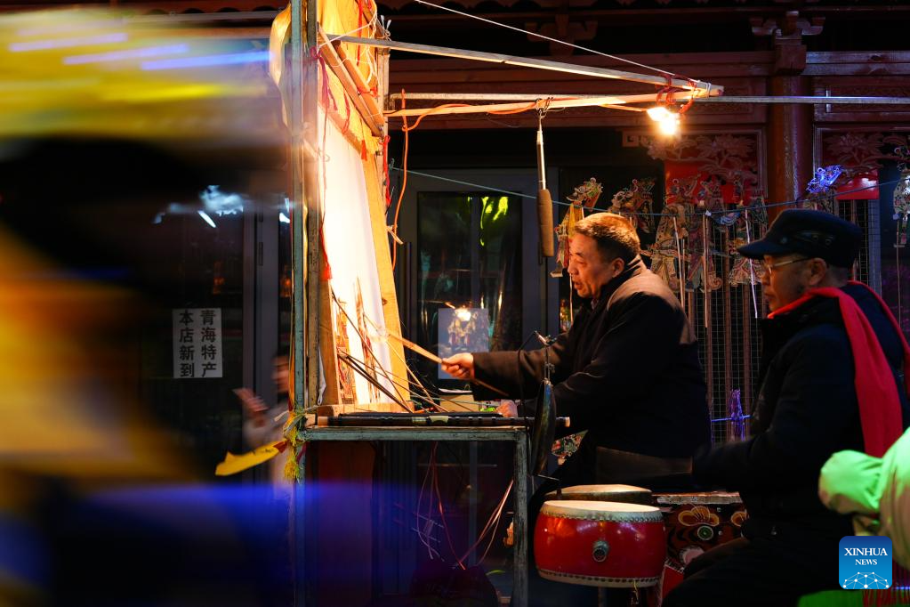XINING, Feb. 12 (Xinhua) -- On a winter night in Xining, capital city of northwest China's Qinghai Province, a beam of light cuts through the cold, casting figures in red and green leather and flowing sleeves into sharp relief as gongs strike and a deliberate chant hangs over the street, holding time itself in suspended motion.