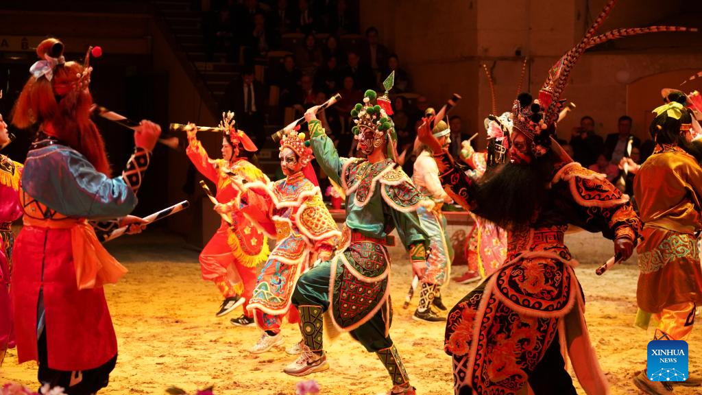 Artists perform the Yingge folk dance from south China's Guangdong Province during a gala celebrating the Chinese Year of the Horse at the Great Stables in the estate of the Chateau de Chantilly in the Hauts-de-France region, France, Feb. 11, 2026. Co-hosted by the Hauts-de-France regional authorities and the Chinese Embassy in France, the event was distinct from many other Chinese New Year activities. At the Great Stables, the highlight was a distinctly local art form: traditional French equestrian performance.(Xinhua/Cui Kexin)