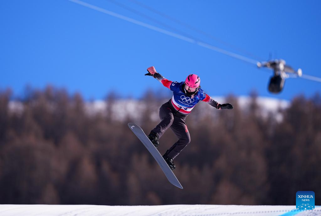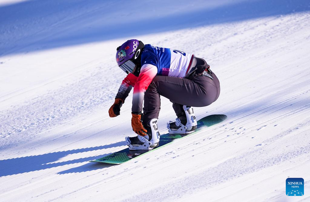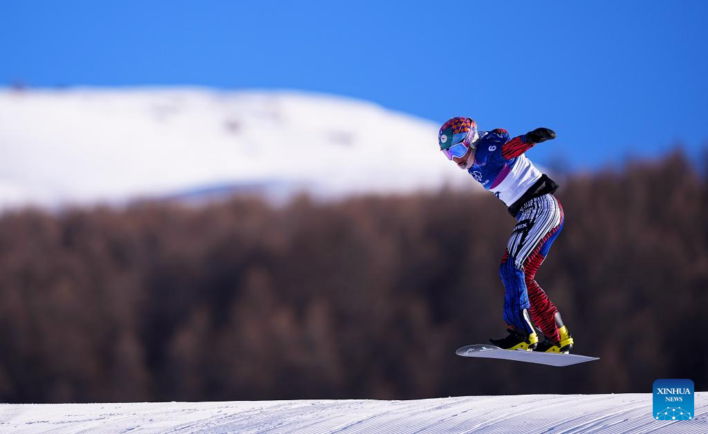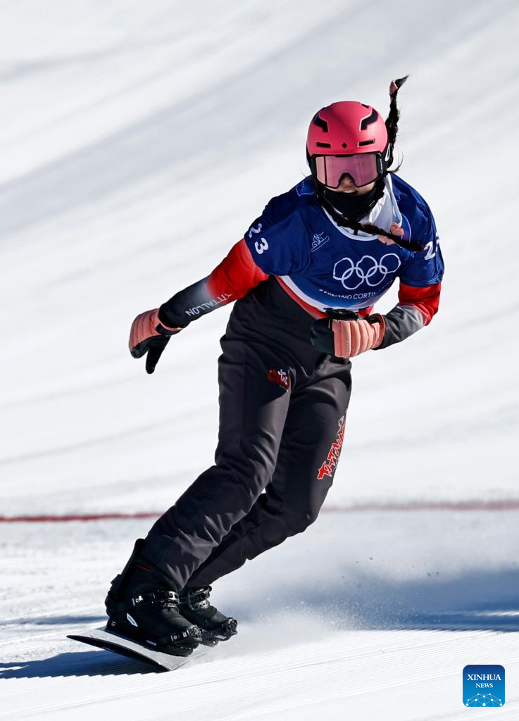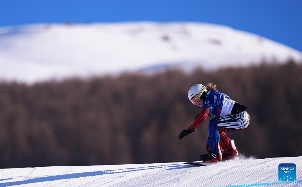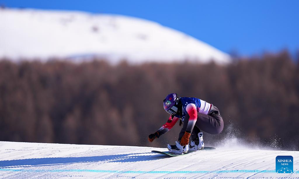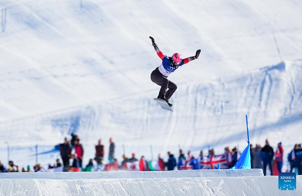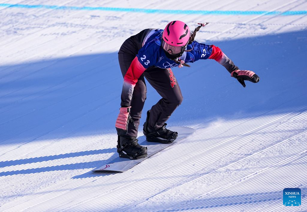 Yongqinglamu of China competes during the snowboard women's cross seeding at the Milan-Cortina 2026 Olympic Winter Games in Livigno, Italy, Feb. 13, 2026. (Xinhua/Wang Peng)