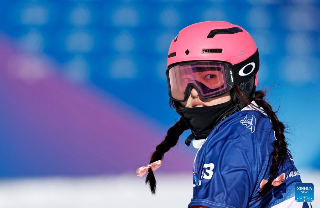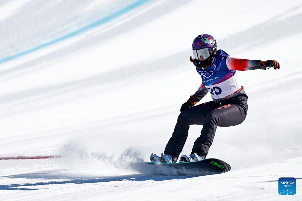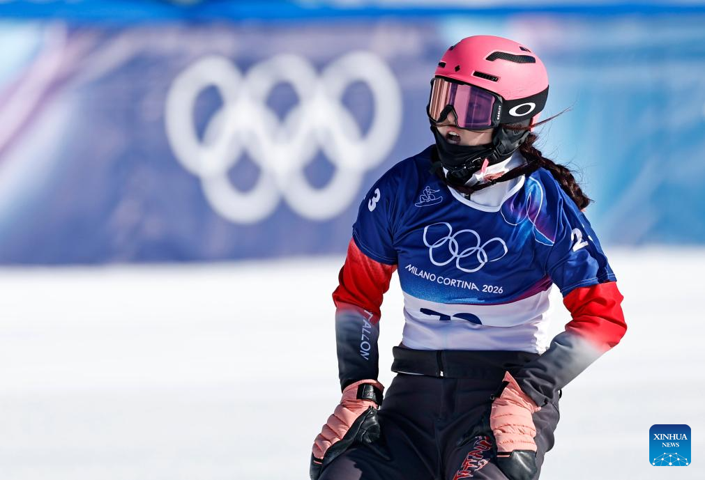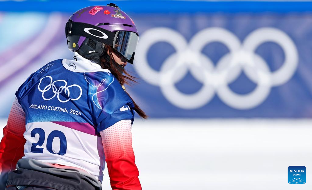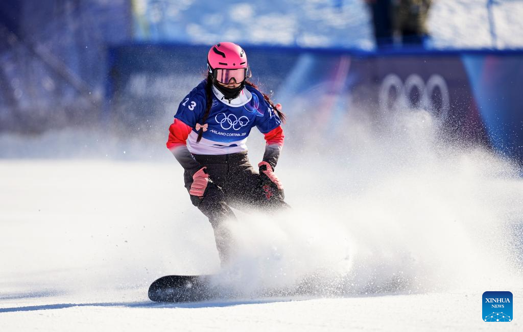 Pang Chuyuan of China competes during the snowboard women's cross seeding at the Milan-Cortina 2026 Olympic Winter Games in Livigno, Italy, Feb. 13, 2026. (Xinhua/Wu Huiwo)