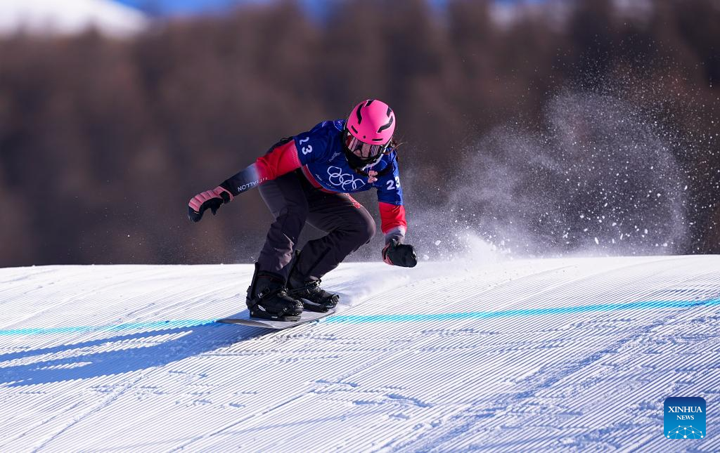 Audrey McManiman of Canada competes during the snowboard women's cross seeding at the Milan-Cortina 2026 Olympic Winter Games in Livigno, Italy, Feb. 13, 2026. (Xinhua/Wu Huiwo)