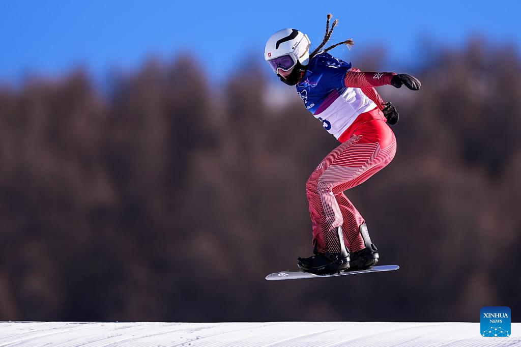 Aline Albrecht of Switzerland competes during the snowboard women's cross seeding at the Milan-Cortina 2026 Olympic Winter Games in Livigno, Italy, Feb. 13, 2026. (Xinhua/Wu Huiwo)