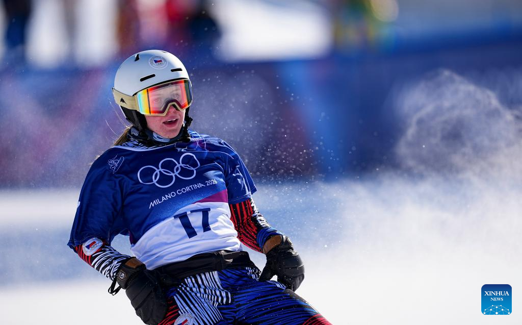 Karolina Hrusova of the Czech Republic competes during the snowboard women's cross seeding at the Milan-Cortina 2026 Olympic Winter Games in Livigno, Italy, Feb. 13, 2026. (Xinhua/Wu Huiwo)