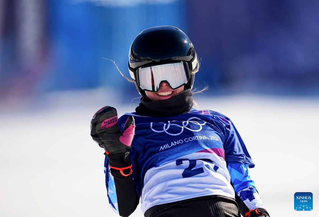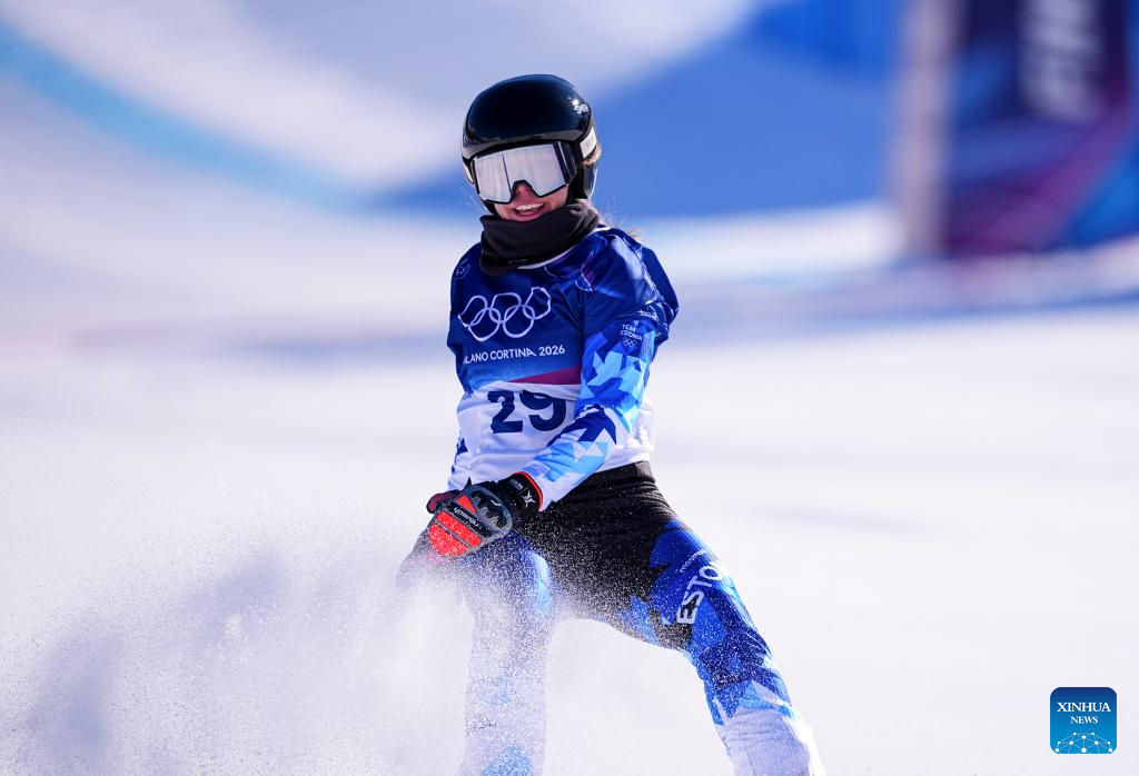 Mai Brit Teder of Estonia competes during the snowboard women's cross seeding at the Milan-Cortina 2026 Olympic Winter Games in Livigno, Italy, Feb. 13, 2026. (Xinhua/Wu Huiwo)