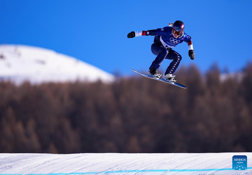 Faye Thelen of the United States competes during the snowboard women's cross seeding at the Milan-Cortina 2026 Olympic Winter Games in Livigno, Italy, Feb. 13, 2026. (Xinhua/Wu Huiwo)