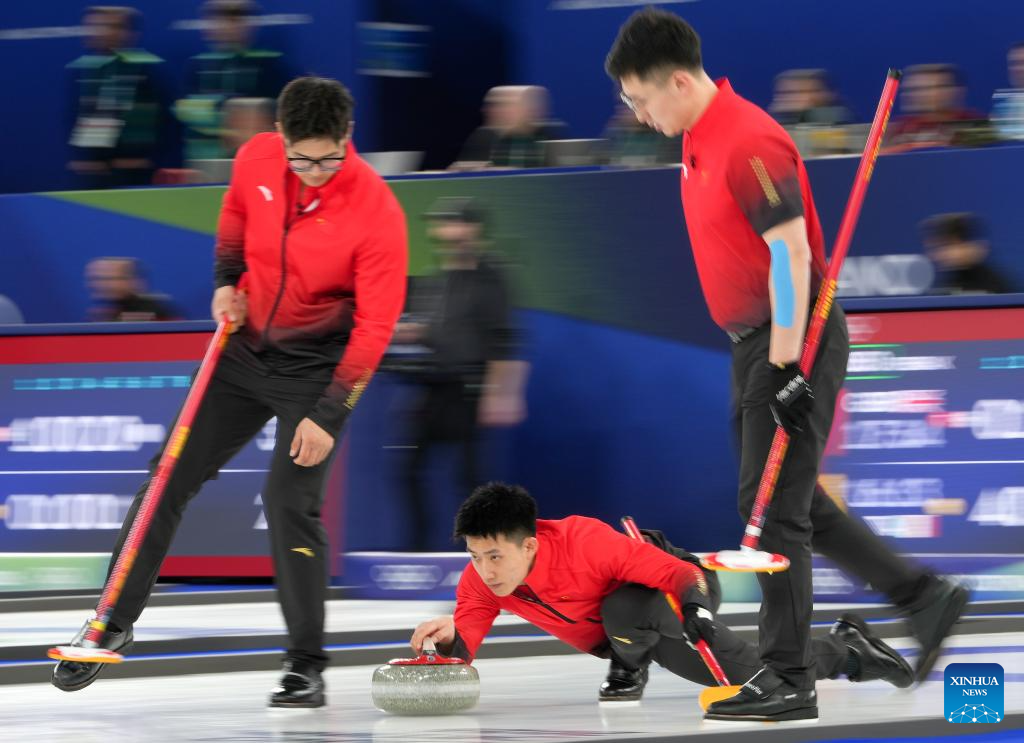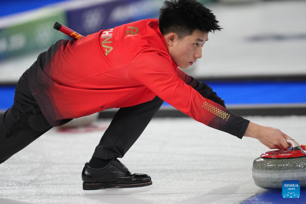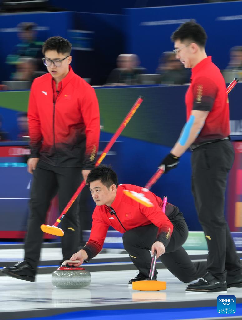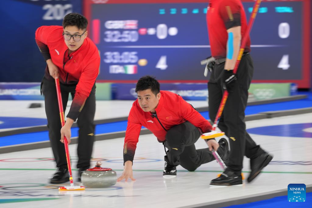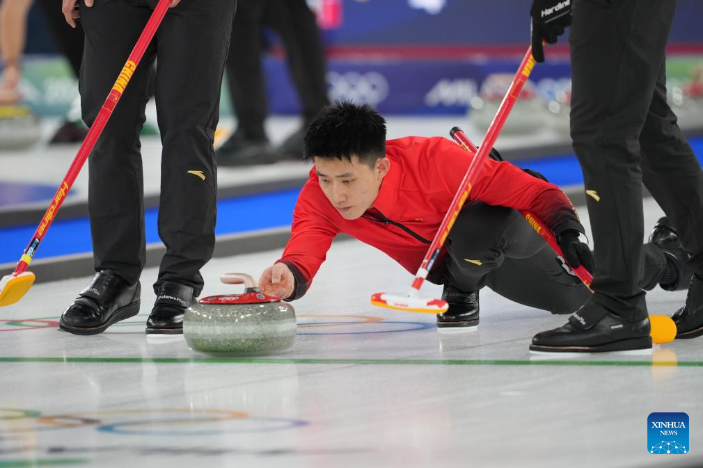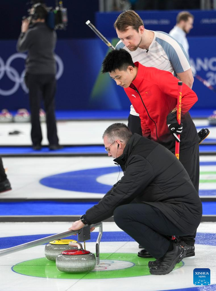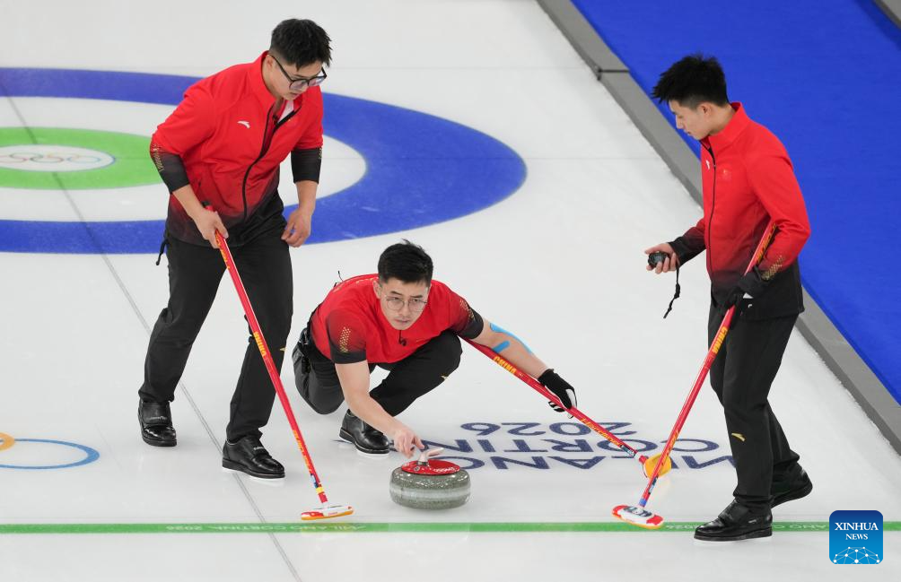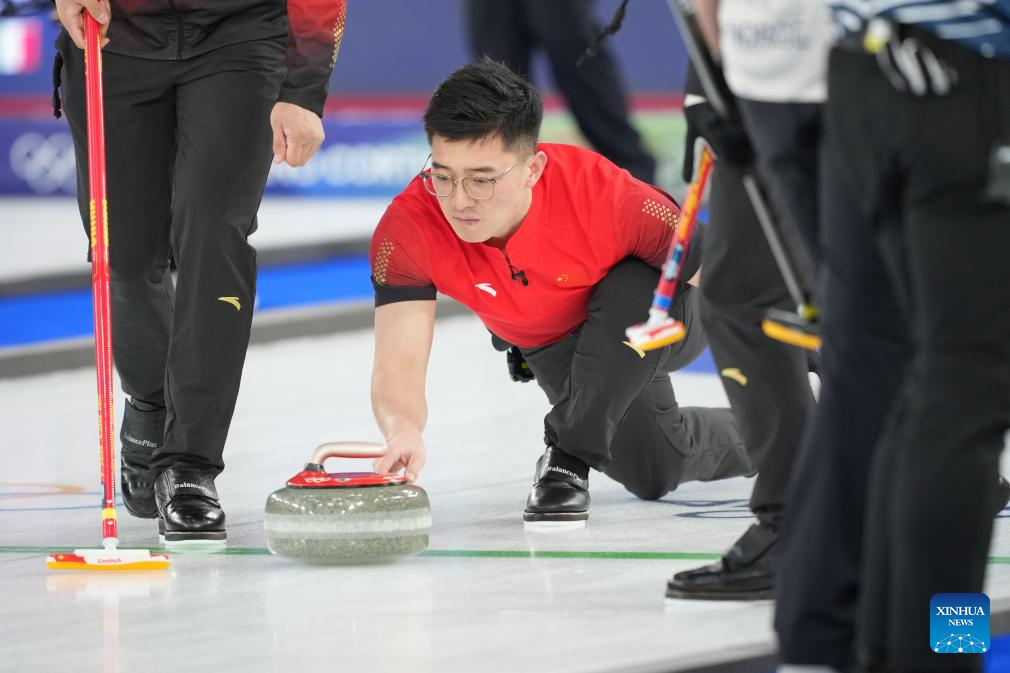Xu Xiaoming (C) of China competes during the curling men round robin session 3 match between China and Norway at the Milan-Cortina 2026 Olympic Winter Games in Cortina, Italy, Feb. 13, 2026. (Xinhua/Li Gang)