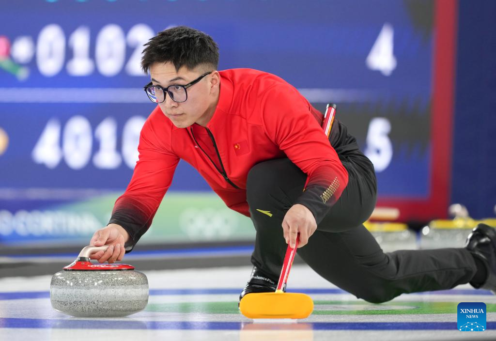 Xu Xiaoming of China competes during the curling men round robin session 3 match between China and Norway at the Milan-Cortina 2026 Olympic Winter Games in Cortina, Italy, Feb. 13, 2026. (Xinhua/Li Gang)