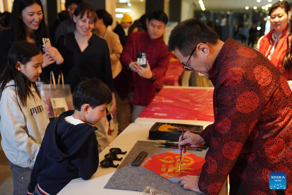 People watch a display of Chinese calligraphy at a Chinese New Year gala at the UN headquarters in New York, on Feb. 12, 2026. (Xinhua/Zhang Fengguo)