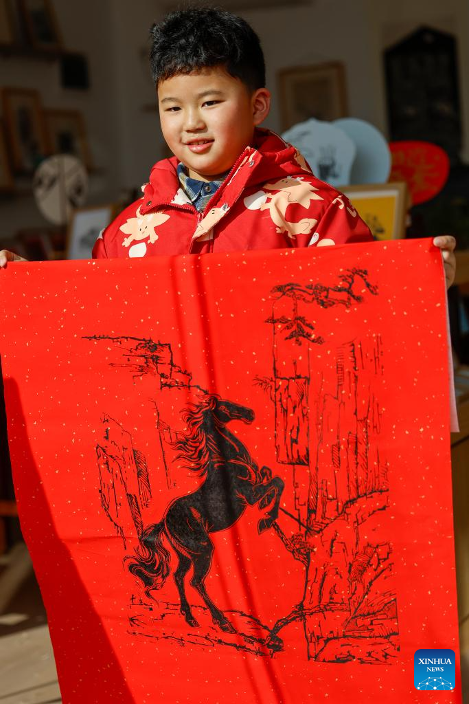 A boy shows a woodblock print themed on the Year of the Horse at a studio in Tunxi District of Huangshan City, east China's Anhui Province, Feb. 11, 2026.(Photo by Shi Yalei/Xinhua)