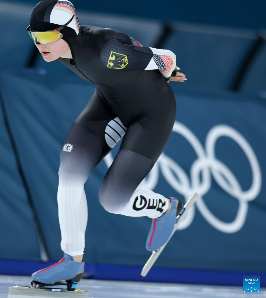 Maira Jasch of Germany competes during the speed skating women's 5000m final at the Milan-Cortina 2026 Olympic Winter Games in Milan, Italy, Feb. 12, 2026. (Xinhua/Li Jing)
