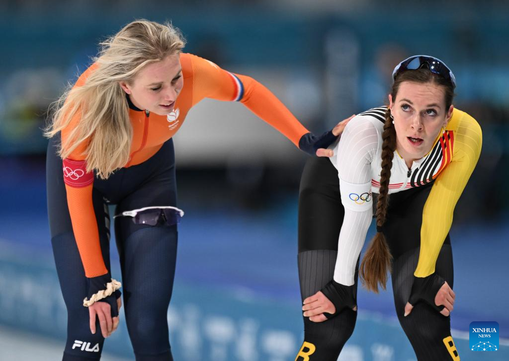 Merel Conijn (L) of the Netherlands interacts with Sandrine Tas of Belgium after the speed skating women's 5000m final at the Milan-Cortina 2026 Olympic Winter Games in Milan, Italy, Feb. 12, 2026. (Xinhua/Wu Wei)