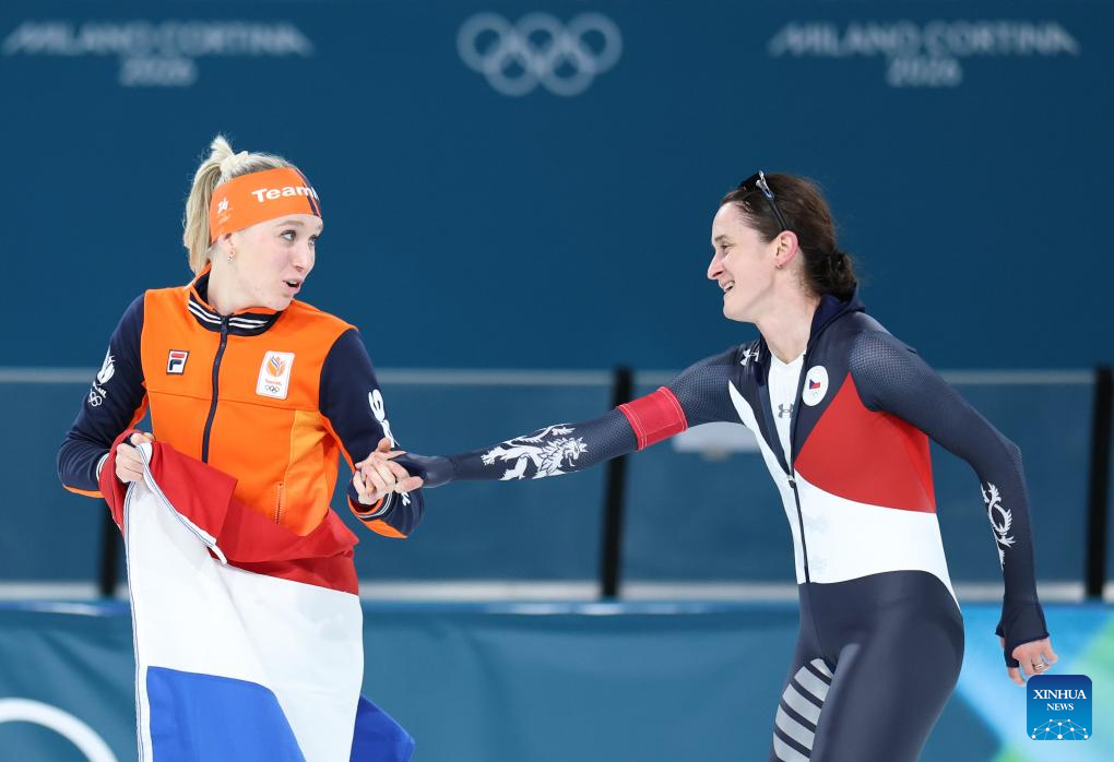 Merel Conijn (L) of the Netherlands interacts with Martina Sablikova of the Czech Republic after the speed skating women's 5000m final at the Milan-Cortina 2026 Olympic Winter Games in Milan, Italy, Feb. 12, 2026. (Xinhua/Li Jing)